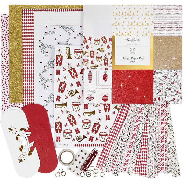 Contenu: 2 feuilles de papier cartonné blanc, 2 feuilles de papier pailleté, 1 feuille de papier velcro, ass. de 4 feuilles de papier design, 4 sets de ceours tressés, ass. de 48 bandes de papier étoiles, 3 m de ficelle cirée, ruban adhésif, 15 annea.