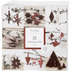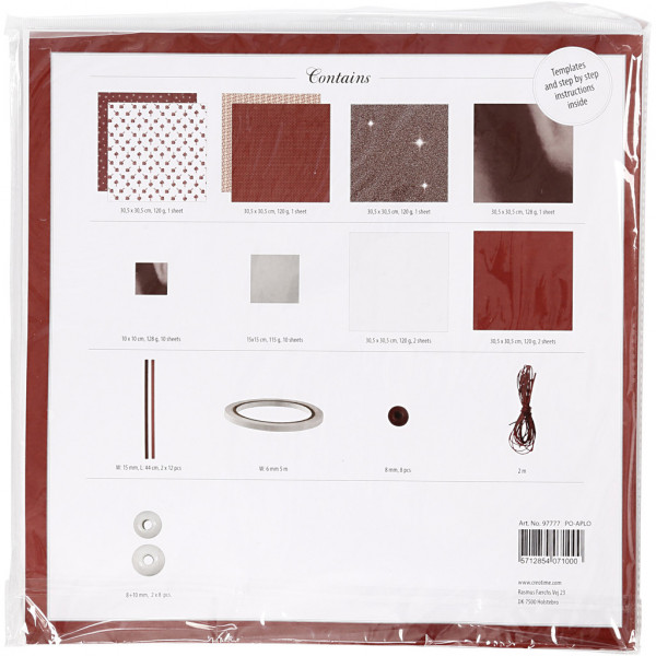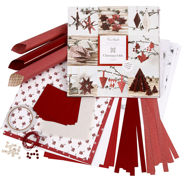 5 feuilles de papier design assorties, 4 feuilles de papier uni assorties, 22 papiers origami assortis, 24 bandes de papier étoiles assorties, 16 perles en verre et en bois assorties, 8,2 m de ficelle de coton ciré, 5 m de bande adhésive double face.