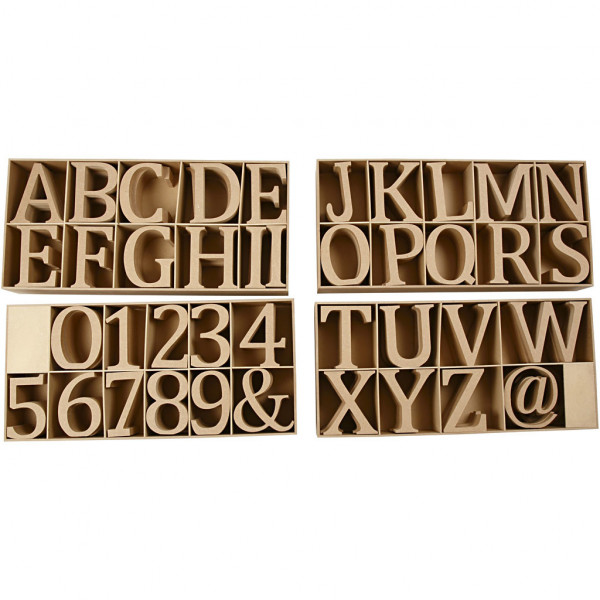 Lettres, chiffres et signes, Boîtes en bois incluses, h: 13 cm, épaisseur 2 cm, MDF, 160pièces [HOB-56348]