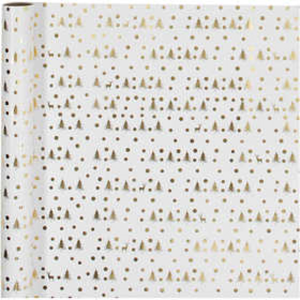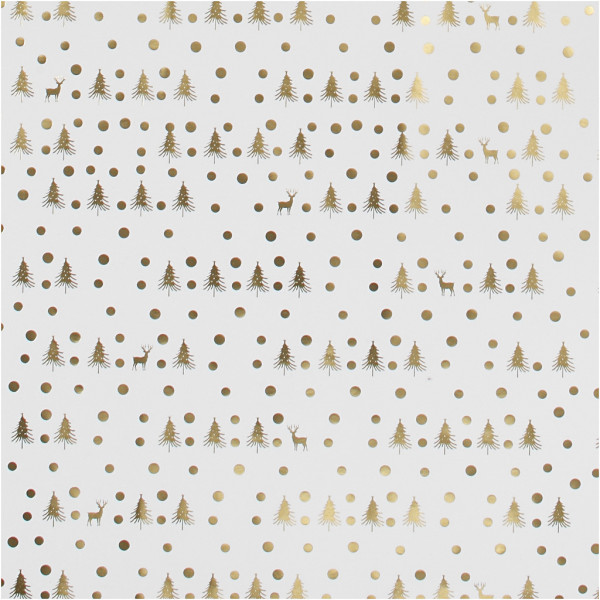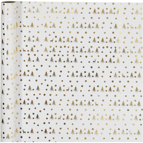 Papier cadeau, l: 57 cm, 80 gr, blanc, or, sapin de Noël avec cerf, 75m [HOB-19046]